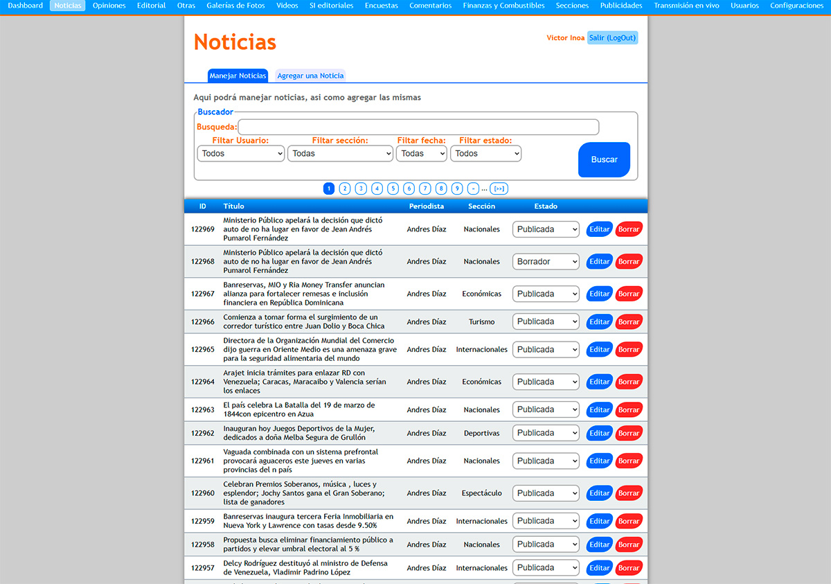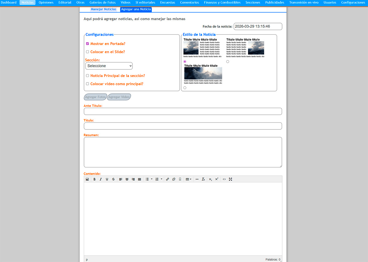 • Gestión Editorial Avanzada: * Módulo de creación de noticias con editor de texto enriquecido.