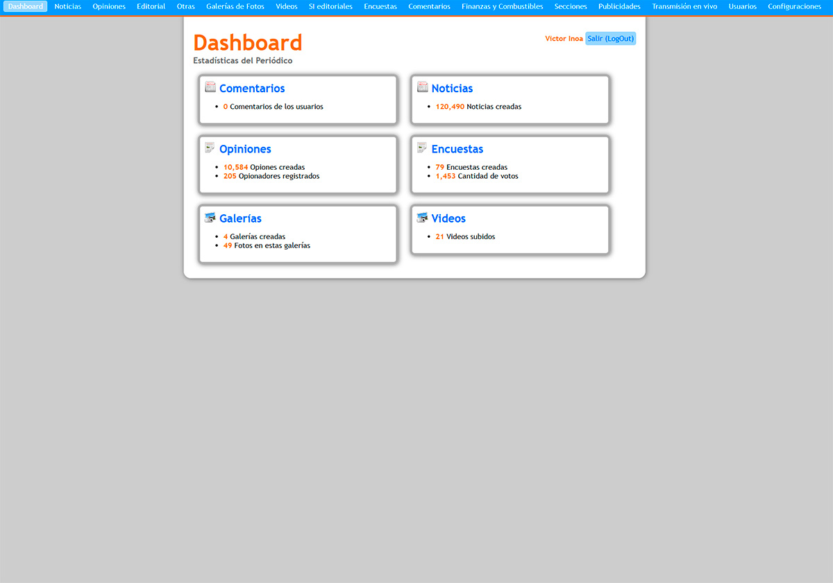 • Dashboard de Estadísticas: Resumen visual de la actividad del periódico, incluyendo conteo de noticias, opiniones, encuestas, galerías y videos.